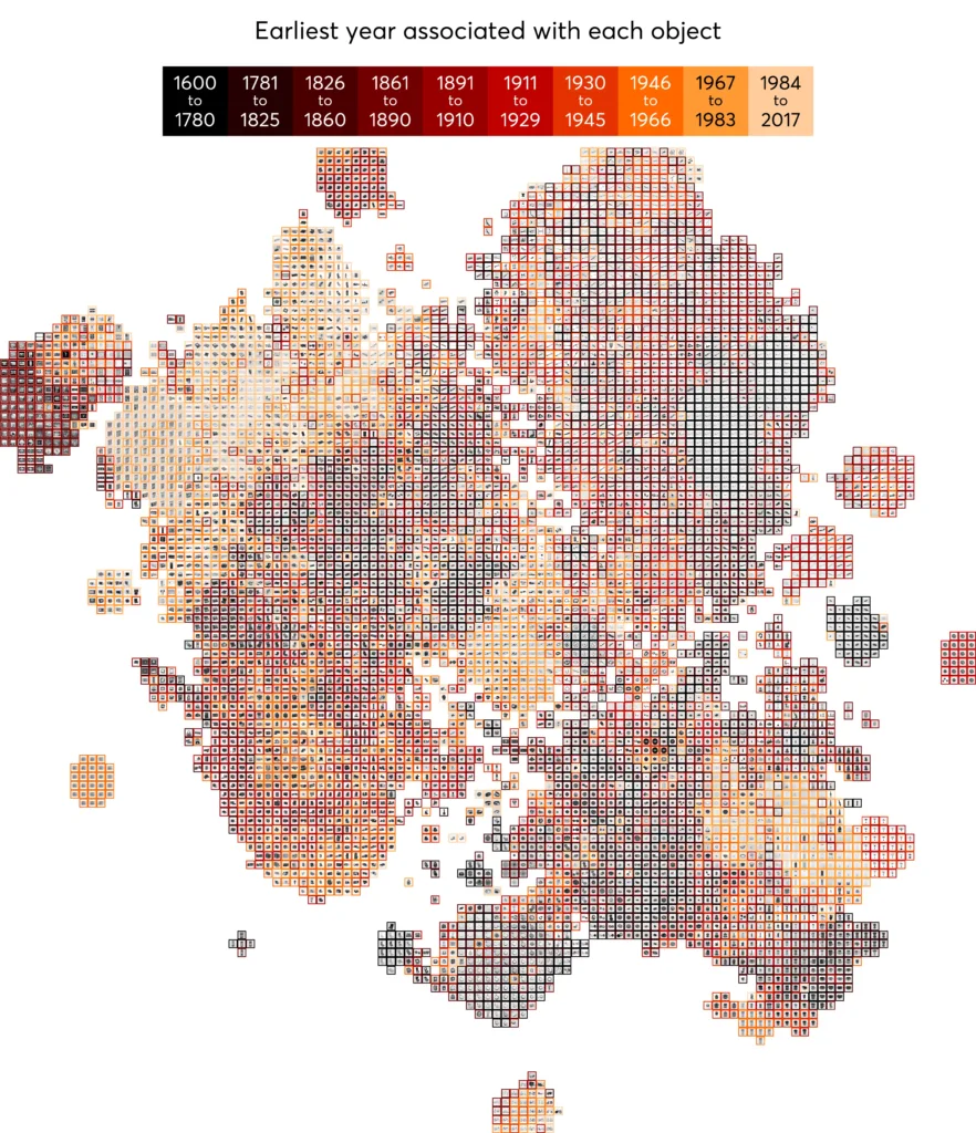 We also examined the shape of everyday objects within the collection, and found that they appear to have become a little squarer overtime. We used machine learning to automatically group the objects (based only on their photos). Similar-looking objects were placed nearer to each other. The border around each image indicates the earliest year associated with the object.
