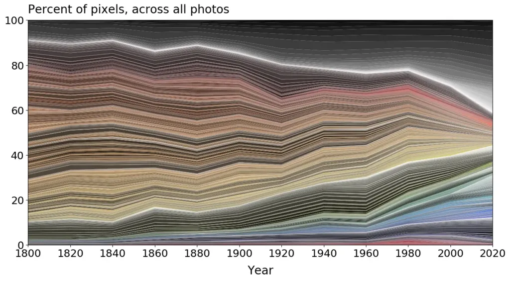 We tracked the colour of objects overtime and found a substantial rise in the use of grey, and a concurrent fall in the use of brown and yellow. These trends likely reflect changes in materials, such as the move away from wood and towards plastic. A smaller trend is the use of very saturated colours which begins in the 1960s.