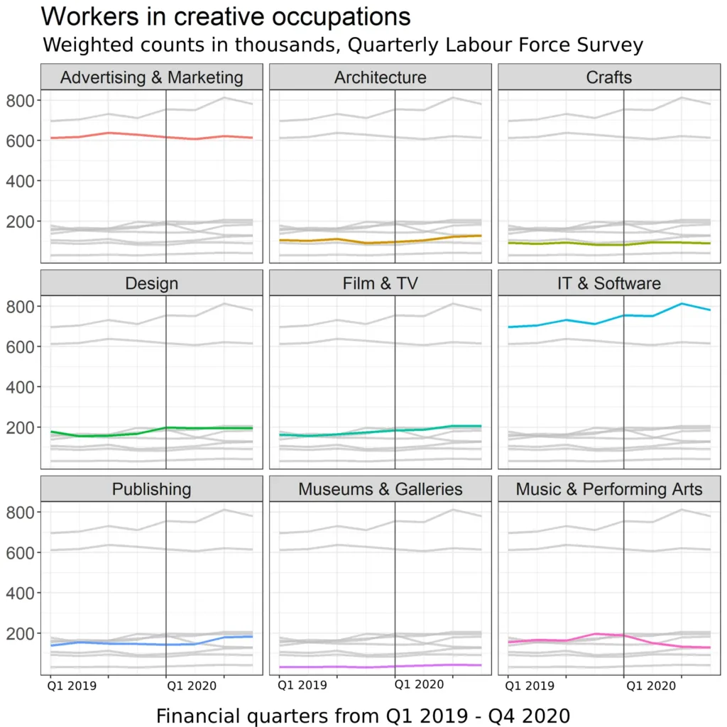 Each panel within Figure 1 shows in colour the trend for the occupation group identified in the heading and, for comparison, shows in grey the trends for all other creative occupation groups. From this picture, you might be forgiven for thinking the impact of COVID-19 on the creative workforce has not been so bad after all. The numbers in work have remained broadly stable across most creative occupations. In total, the creative workforce actually grew by 6% in the year to 2020 Q4, compared to essentially no change in the non-creative workforce.