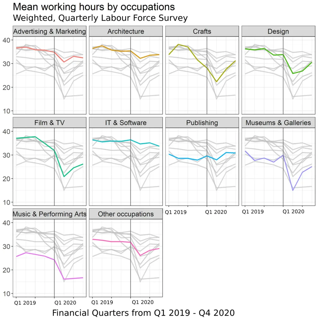 1. Note the significant variation in hours worked even prior to the pandemic. In 2019 Q4, those in creative occupations worked for 34 hours per week on average compared with 32 hours for those in other occupations. Within the creative workforce, however, those in Publishing, Museums, galleries and libraries and Music, performing and visual arts occupations all worked below average hours (with means of 28, 27 and 26 hours respectively). These differences may be accounted for by differences in the preponderance of part-time working and portfolio careers in occupation groups like Publishing and the Music, performing and visual arts; factors that we are investigating in our research.