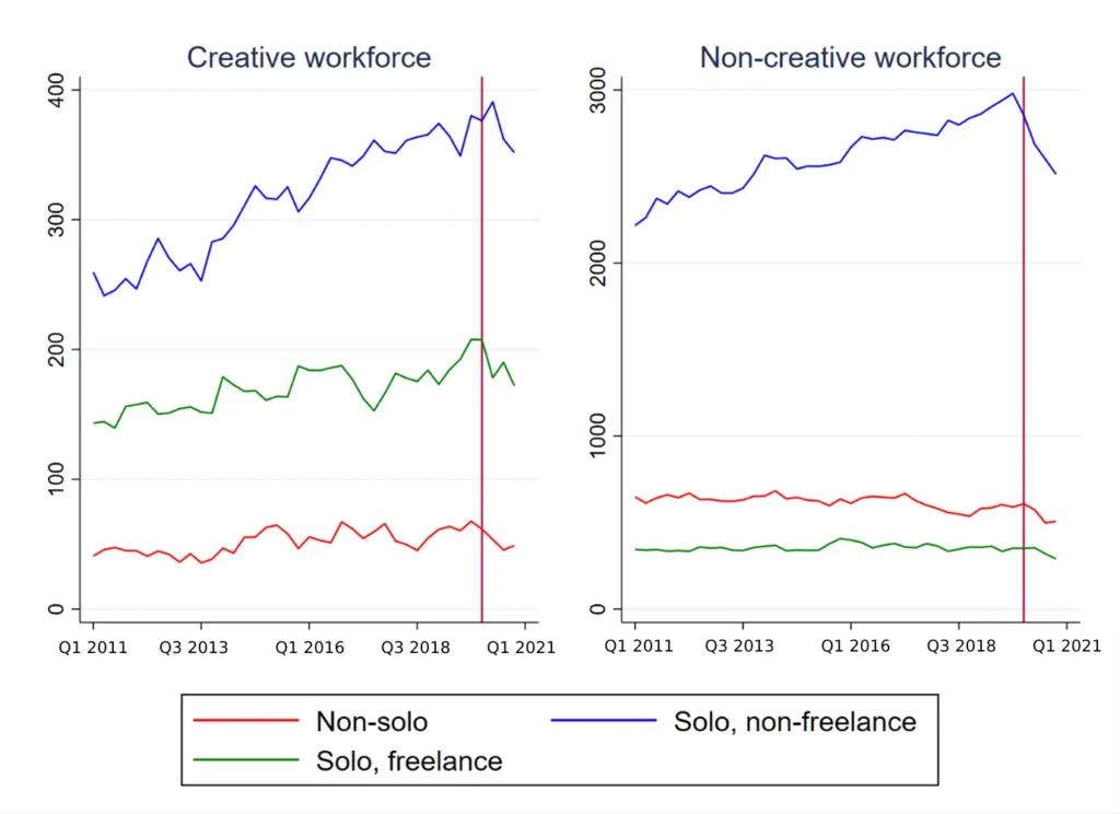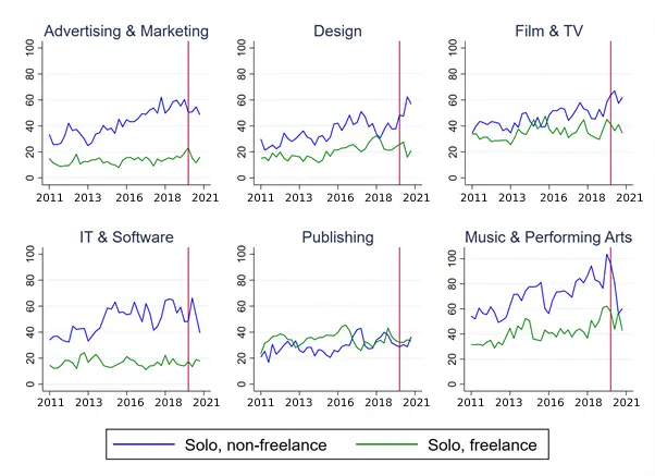 2. Here, we encounter small sample sizes such that we cannot report non-solo workers. For the solos, only those occupations for which we have sufficient observations for both freelance and non-freelance are included in the Figure.
