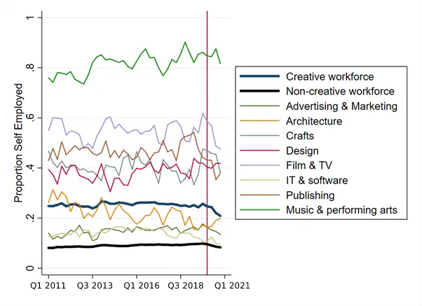 Figure 3 shows that self-employment is especially important in the creative workforce (compare the thick lines). This is true across all occupation groups but is particularly marked within Music, performing and visual arts and Film, TV, video, radio and photography. In the Labour Force Survey as a whole, there has been an increase in the number of people moving from self-employment to employee while staying in the same role. Figure 3 shows that the proportion of the creative workforce that is self-employed has fallen to a greater extent than is true for other workers since the onset of the pandemic. At the level of occupation groups, the COVID-19 dip is masked by quarter-on-quarter variations but appears to have particularly affected Film, TV, video, radio and photography, Crafts, and Publishing.