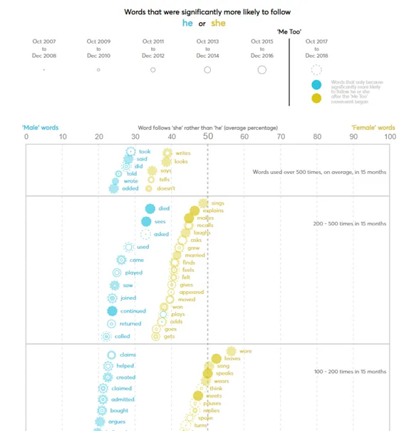 The chart below shows those individual words that have been significantly more likely to follow ‘he’ and ‘she’. The number of circles next to each word denotes the number of periods in which the word was significant (there are 15 months in each period), with larger circles representing more recent periods. Only words that were significant in at least two periods are shown, except for the recent (‘post Me-Too’) period, where all significant words are shown.
