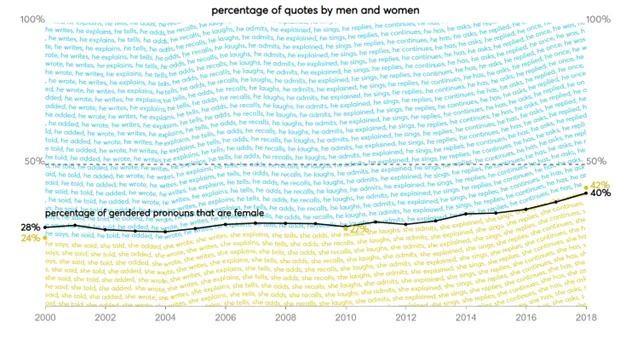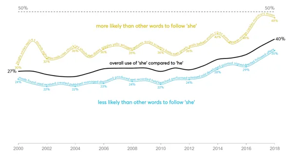 From each article we collected mentions of male and female third-person singular pronouns (he, himself, his, him, she, herself, hers and her) as well as the words that followed ‘he’ and ‘she’. Unfortunately it was not possible to collect mentions of people who identify as non-binary because non-gendered pronouns are also used as plural pronouns. We did find that references to these pronouns (‘they’, ‘them’, ‘their’, ‘theirs’ and ‘themselves’) have remained fairly constant over the last 19 years, comprising between 25% and 29% of all third-person pronouns. The word ‘non-binary’ has been used just over 100 times (in the set of articles that we analysed), and over 50 of those mentions were made in the last year (2018).