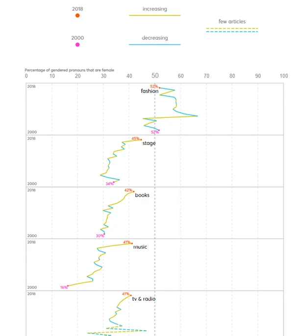 The analysis that follows is based on over half a million articles published in The Guardian newspaper between 2000 and 2018. These articles were taken from sections of the paper relating to the creative industries, including Fashion, Stage, Media, Books and Games.1 Amongst British newspapers, The Guardian reports extensively on the creative industries and, unlike any other major newspaper, it offers open access (via an API) to its content. It is for this reason that our research focuses on The Guardian and we were unable to measure the representation of women in other newspapers. Open data is the key ingredient to enabling more in-depth analysis of diversity.