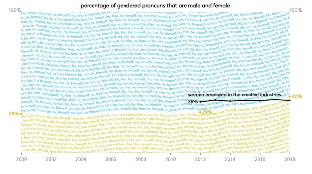 As the chart above shows, words that were significantly more likely to follow ‘he’ are often in the past tense, while words that follow ‘she’ tend to be in the present tense. For example, ‘said’ has been significantly more likely to follow ‘he’, while ‘says’ has been more likely to follow ‘she’. This might be due to the gender mix in the creative industries being even more unbalanced in the past than it is currently. Decades of large imbalances may have led to many more instances of ‘he said’ than ‘she said’, causing these past-tense words to become associated with male pronouns. The gradual increase in female creatives has meant that the ratio of ‘she says’ to ‘he says’ is substantially higher, leading these present-tense words to become associated with ‘she’.