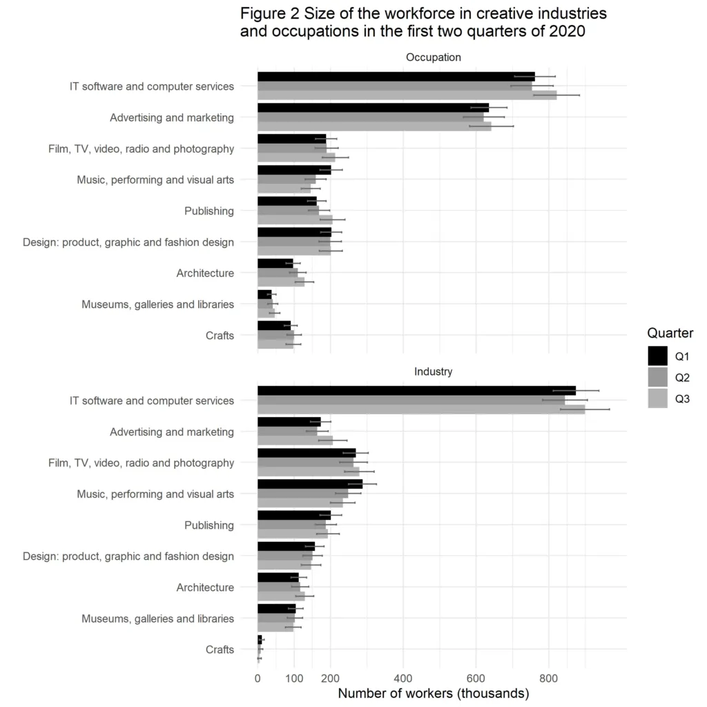 When we looked in more detail at specific sub-sectors in the creative industries, or occupational groups – such as publishing, architecture, and crafts – we found that for most of the creative industries and most creative occupations, there have not been large changes in the number of workers across the first three quarters of 2020 (figure 2).