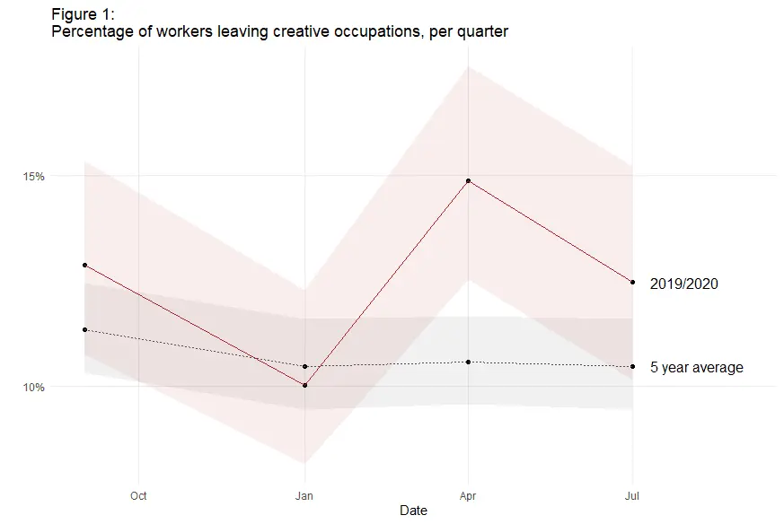 Using the ONS dataset, we found that 15% of people who worked in creative occupations in January-March in 2020 were no longer working in creative occupations in April-June (see figure 1). This is significantly greater than between the same period in the previous five years, where on average we see around 10.5% of creatives leave the sector.