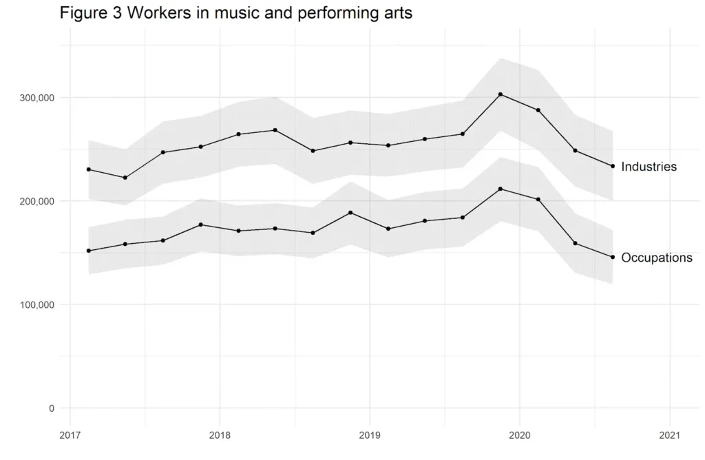 - 55,000 job losses (a 30% decline) in music, performing and visual arts