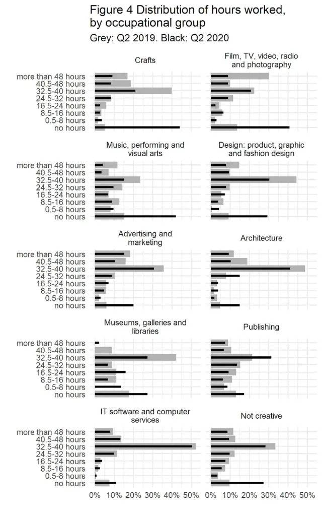 The data also showed us that the reduction in hours has not fallen evenly across the creative industries – those working in crafts, film, TV, video, radio and photography, music, performing and visual arts, and design are the most severely affected.