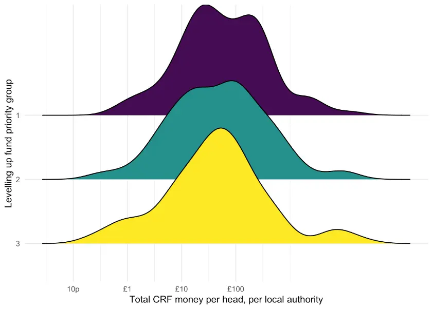 Analysis of the allocation of Rounds One and Two of the Cultural Recovery Fund (CRF) distributed by Arts Council England, National Heritage Lottery Fund and BFI shows that when it comes to accessing emergency funds, place matters. Figure 1 shows there are similar patterns of distribution of CRF per capita across all three tiers of the Government’s ‘Levelling Up’ priority areas (banded by measures of productivity, unemployment rates, transport connectivity and regeneration).