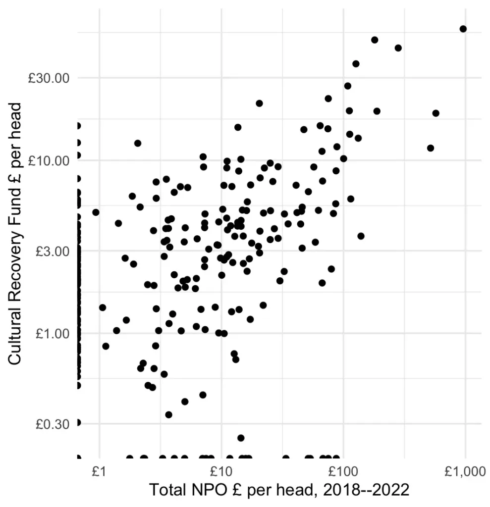 But a closer analysis reveals that those areas with lower levels of deprivation, existing flagship cultural institutions and larger numbers of National Portfolio Organisations (NPOs) were more likely to receive more CRF investment per head, perpetuating the maxim that ‘existing funding attracts future funding’. Figure 2 shows that when plotted against NPO funding, Arts Council England CRF grants have largely followed patterns of where culture funding has gone before.