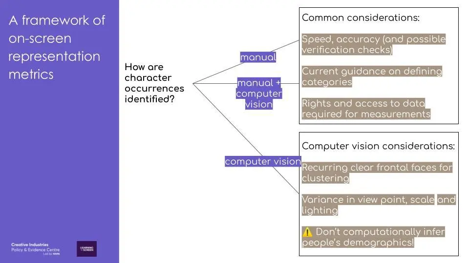 There is a growing body of research on computer vision and faces, especially around algorithmic fairness in recent years. But much more research is needed on when face detections are missed and the causes of this, as well as the factors that cause different faces to be mistaken as the same face. A programme that has many recurring frontal faces will allow the ‘tracks’ (see below) to be more easily clustered, allowing the identification of most to all appearances of the same character. This makes applying computer vision to identify character occurrences easier. But programmes that have higher variance in viewpoint, more crowds (smaller faces) and darker lighting, would give less reliable clustered faces. Finally, in the longer term, technical recommendations (e.g. downsampling the frame rate from the broadcast 25 fps) and data standards specific to representation metrics can be developed.