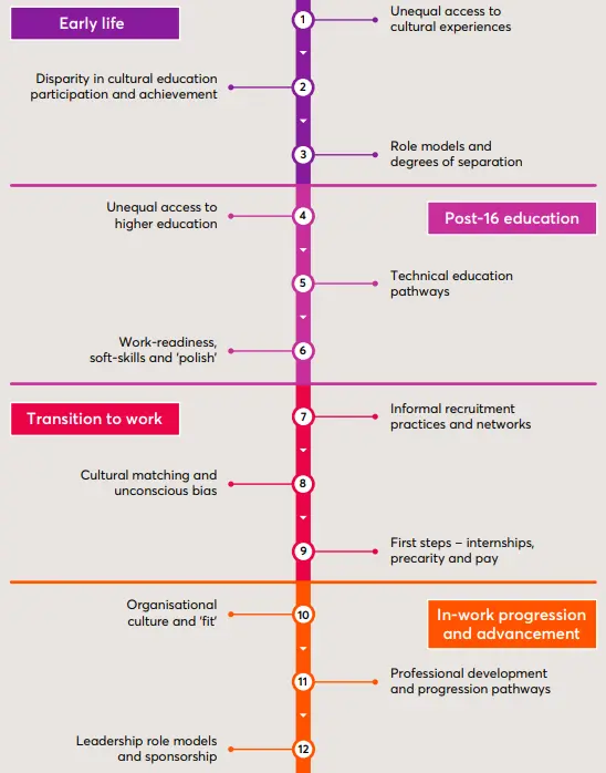 The study finds 12 points at which people from a working-class background are at a severe disadvantage when it comes to entering and progressing in work in the screen sector. These span early in life, in post-16 education, when entering work, and when in work.